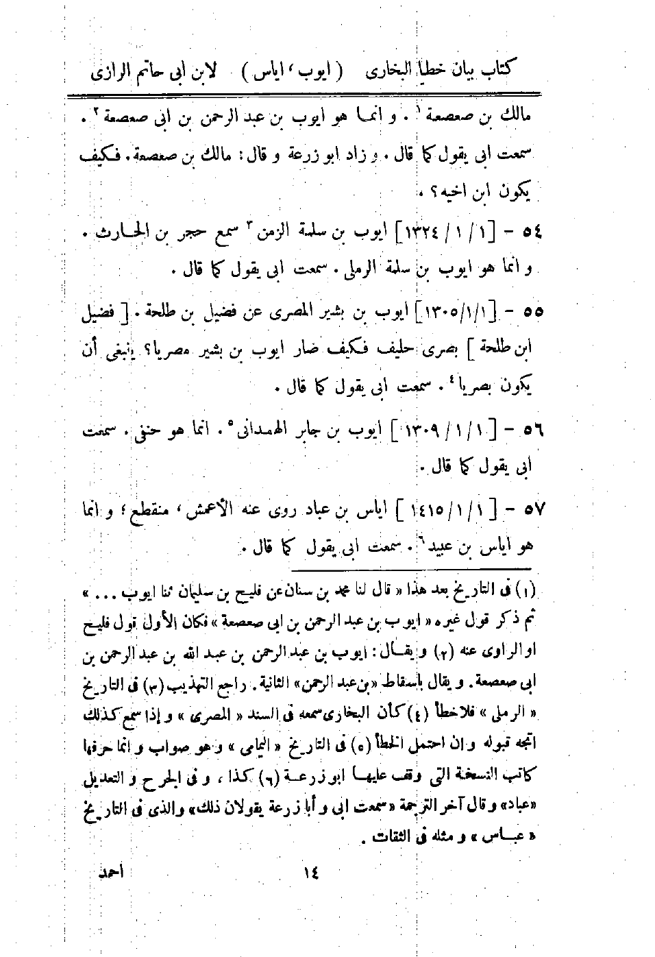 (1) في التاريخ بعد هذا " قال لنا محمد بن سنان عن فليح بن سليمان ثنا ايوب ... " ثم ذكر قول غيره " ايوب بن عبد الرحمن بن ابى صعصعة " فكان الاول قول فليح أو الراوى عنه (2) ويقال " ايوب بن عبد الرحمن بن عبد الله بن عبد الرحمن بن ابى صعصعة.