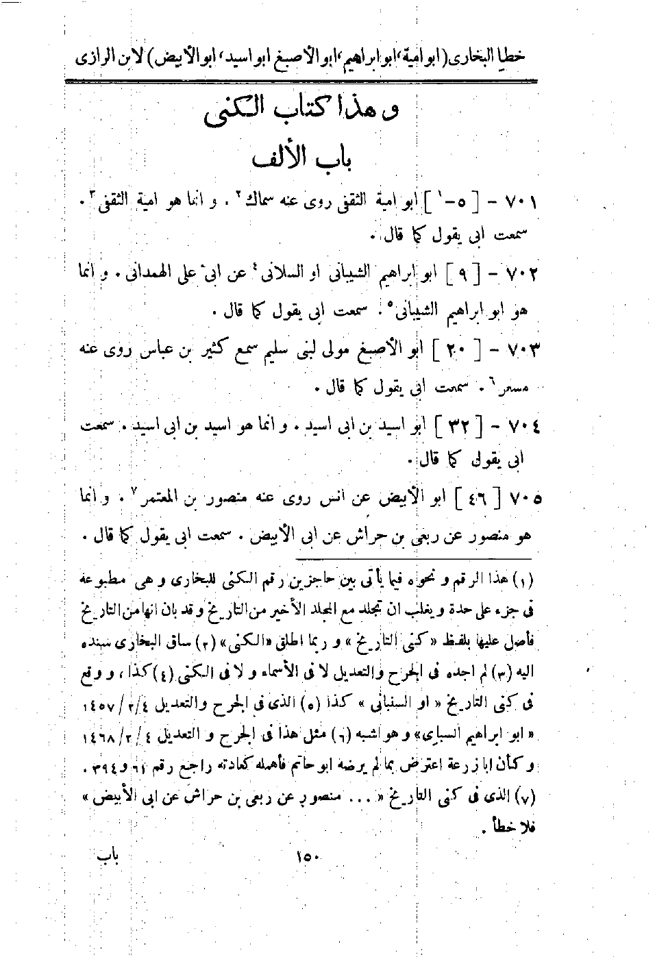 فأصل عليها بلفظ " كنى التاريخ " وربما اطلق " الكنى " (2) ساق البخاري سنده إليه (3) لم اجده في الجرح والتعديل لا في الاسماء ولا في الكنى (4) كذا، ووقع في كنى التاريخ " أو السنبانى " كذا (5) الذى في الجرح والتعديل 4 / 2 / 1457 " أبو ابراهيم السباى " وهو اشبه (6) مثل هذا في الجرح والتعديل 4 / 2 / 1468 وكأن ابا زرعة اعترض بما لم يرضه أبو حاتم فأهمله كعادته راجع رقم 61 و 394.