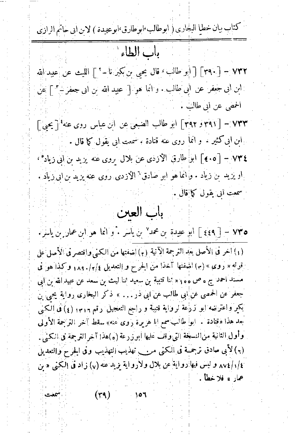 باب الطاء (1) 732 -[390] [أبو طالب، قال يحيى بن بكير نا - (2) ] الليث عن عبيد الله ابن ابى جعفر عن ابى طالب.