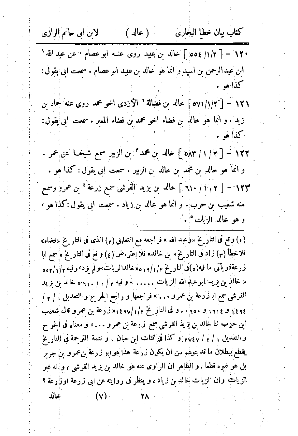 (1) وقع في التاريخ " وعبد الله " فراجعه مع التعليق (2) الذى في التاريخ " فضاء " فلا خطأ (3) زاد في التاريخ " بن خالد " فلا اعتراض (4) وقع في التاريخ " سمع ابا زرعة " ويأتى ما فيه (5) في التاريخ 2 / 1 / 519 " خالد الزيات " ولم يزد، وفيه 2 / 1 / 552 " خالد بن يزيد أبو عبد الله الزيات ... " وفيه 2 / 1 / 610 " خالد بن يزيد القرشى سمع ابا زرعة بن عمرو.." فراجعها وراجع الجرح والتعديل 1 / 2 / 1494 و 1614 و 1650.