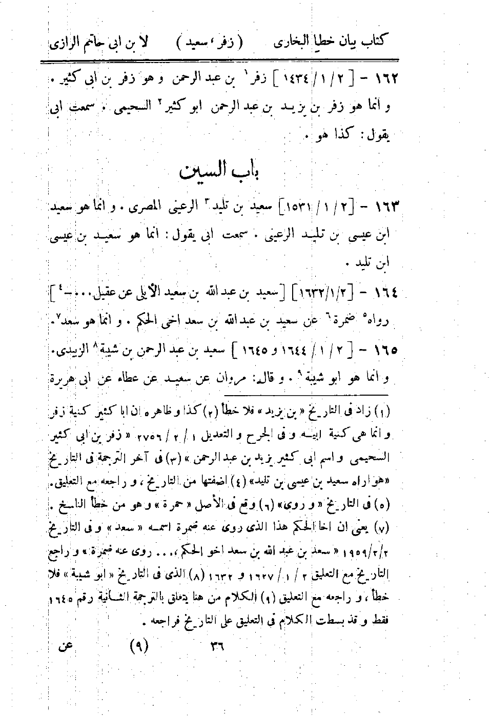 (1) زاد في التاريخ " بن يزيد " فلا خطأ (2) كذا وظاهره ان ابا كثير كنية زفر وانما هي كنية ابيه وفى الجرح والتعديل 1 / 2 / 2756 " زفر بن ابى كثير السحيمى واسم ابى كثير يزيد بن عبد الرحمن " (3) في آخر الترجمة في التاريخ " هو اراه سعيد بن عيسى بن تليد " (4) اضفتها من التاريخ، وراجعه مع التعليق.