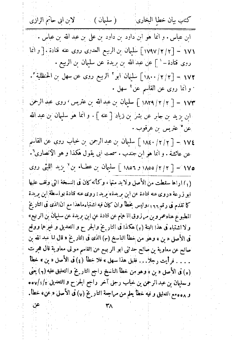 (1) اراها سقطت من الاصل ولا بد منها، وكأنه كان في النسخة التى وقف عليها أبو زرعة " روى عنه قتادة عن ابن بريدة " يريد: روى عنه قتادة بواسطة ابن بريدة كما تقدم في رقم 166: وليس بخطأ وان كان فيه اشتباه ما هذا مع ان الذى في التاريخ المطبوع هنا " عمرو بن مرزوق انا همام عن قتادة عن ابن بريدة عن سليمان بن الربيع " ولا اشتباه في هذا البتة (2) هكذا في التاريخ والجرح والتعديل وغيرهما ووقع في الاصل " بن " وهو من خطأ الناسخ (3) الذى في التاريخ " قال لنا عبد الله بن صالح عن معاوية بن صالح حدثنى أبو الربيع عن القاسم مولى معاوية قال هجرت ... فرأيت رجلا..فقيل هذا سهل " فلا خطأ (4) في الاصل " بن " خطأ (5) في الاصل " بن " وهو من خطأ الناسخ راجع التاريخ والتعليق عليه (6) يعنى وسليمان بن عبد الرحمن بن خباب رجل آخر راجع الجرح والتعديل 2 / 1 / 557 و 558 مع التعليق وفيه خطأ يعلم من مراجعة التاريخ (7) في الاصل " عن " خطأ.