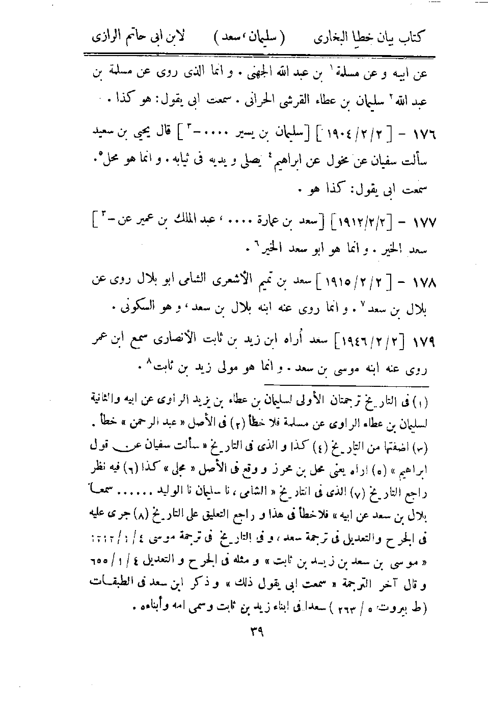 (3) اضفتها من التاريخ (4) كذا والذى في التاريخ " سألت سفيان عن قول ابراهيم " (5) اراه يعنى محل بن محرز ووقع في الاصل " مجلى " كذا (6) فيه نظر راجع التاريخ (7) الذى في التاريخ " الشامي، نا سليمان نا الوليد ... سمعا بلال بن سعد عن ابيه " فلا خطأ في هذا وراجع التعليق على التاريخ (8) جرى عليه في الجرح والتعديل في ترجمة سعد، وفى التاريخ في ترجمة موسى 4 / 1 / 1212 " موسى بن سعد بن زيد بن ثابت " ومثله في الجرح والتعديل 4 / 1 / 655 وقال آخر الترجمة " سمعت ابى يقول ذلك " وذكر ابن سعد في الطبقات (ط بيروت 5 / 263) سعدا في ابناء زيد بن ثابت وسمى امه وأبناءه.