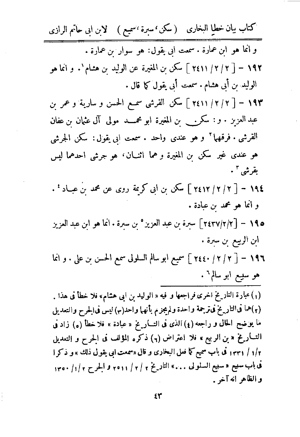 (2) هما في التاريخ في ترجمة واحدة ولم يجزم بأنهما واحد (3) ليس في الجرح والتعديل ما يوضح الحال وراجعه (4) الذى في التاريخ " عبادة " فلا خطأ (5) زاد في التاريخ " بن الربيع " فلا اعترض (6) ذكره المؤلف في الجرح والتعديل 2 / 1 / 1331 في باب سميع كما فعل البخاري وقال " سمعت ابى يقول ذلك " وذكرا في باب سبيع " سبيع السلولى.." التاريخ 2 / 2 / 2511 والجرح 2 / 1 / 1350 والظاهر انه آخر.