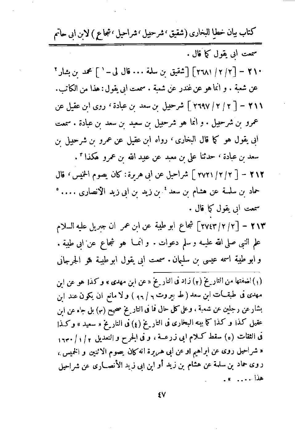 (1) اضفتها من التاريخ (2) زاد في التاريخ " عن ابن مهدى " وكذا هو عن ابن مهدى في طبقات ابن سعد (ط بيروت 6 / 96) ولا مانع ان يكون عند ابن بشار عن رجلين عن شعبة، وعلى كل حال فما في التاريخ صحيح (3) بل جاء عن ابن عقيل كذا وكذا كما بينه البخاري في التاريخ (4) في التاريخ " سعيد " وكذا في الثقات (5) سقط كلام ابى زرعة، وفى الجرح والتعديل 2 / 1 / 1630 " شراحيل روى عن ابراهيم أو عن ابى هريرة انه كان يصوم الاثنين والخميس، روى حماد بن سلمة عن هشام بن زيد أو ابن ابى زيد الانصاري عن شراحيل هذا ... ".