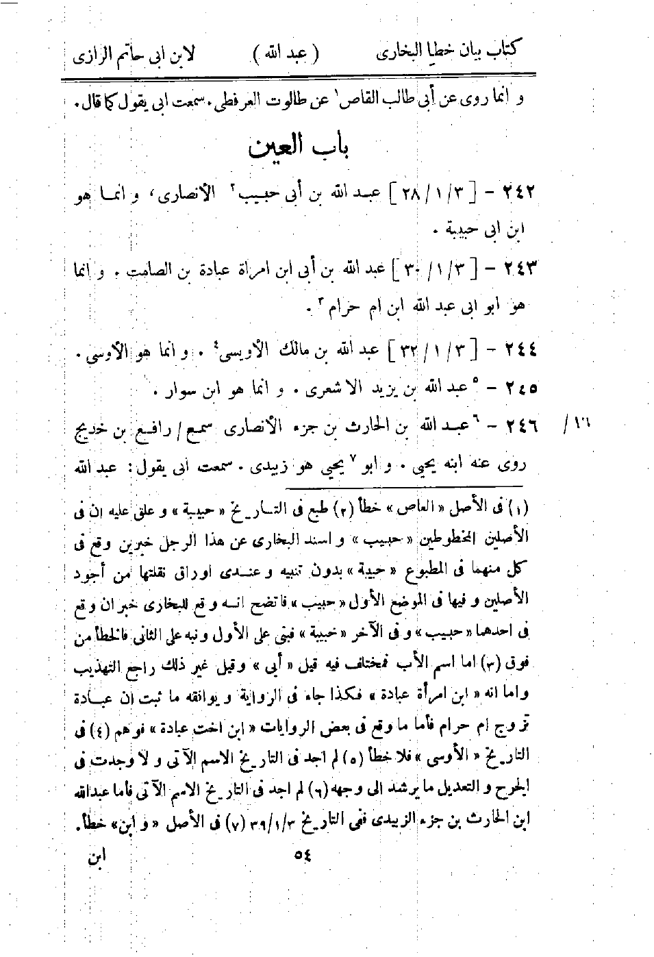 (1) في الاصل " العاص " خطا (2) طبع في التاريخ " حبيبة " وعلق عليه ان في الاصلين المخطوطين " حبيب " واسند البخاري عن هذا الرجل خبرين وقع في كل منهما في المطبوع " حبيبة " بدون تنبيه وعندي اوراق نقلتها من أجود الاصلين وفيها في الموضوع الاول " حبيب " فاتضح انه وقع للبخاري خبران وقع في احداهما " حبيب " وفي الآخر " حبيبة " فبنى على الاول ونبه على الثاني فالخطا من فوق (3) اما اسم الاب فمختلف فيه قيل " أبى " وقيل غير ذلك راجع التهذيب واما انه " ابن امرأة عبادة " فكذا جاء في الرواية ويوافقه ما ثبت ان عبادة تزوج ام حرام فأما ما وقع في بعض الروايات " ابن اخت عبادة " فوهم (4) في التاريخ " الاوسي " فلا خطا (5) لم اجد في التاريخ الاسم الآتى ولا وجدت في الجرح والتعديل ما يرشد إلى وجهه (6) لم اجد في التاريخ الاسم الآتى فأما عبد الله ابن الحارث بن جزء الزبيدى ففى التاريخ 3 / 1 / 39 (7) في الاصل " وابن " خطا.