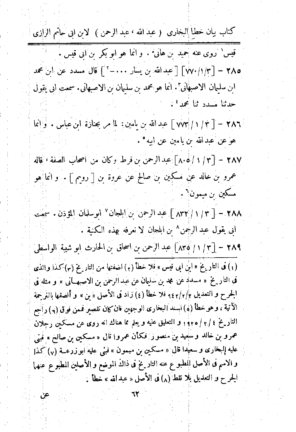 (1) في التاريخ " ابن ابى قيس " فلا خطأ (2) اضفتها من التاريخ (3) كذا والذى في التاريخ " مسدد عن محمد بن سليمان عن عبد الرحمن بن الاصبهاني " ومثله في الجرح والتعديل 2 / 2 / 942 فلا خطأ زاد في الاصل " بن " وألصقها بالترجمة الاتية، وهو خطأ (5) اسند البخاري الوجهين فان كان تقصير فمن فوق (6) راجلا التاريخ 4 / 2 / 1925 والتعليق عليه ويعلم مما هناك انه روى عن مسكين بن صالح " فبنى عليه البخاري وسعيدا قال " مسكين بن ميمون " فبنى عليه أبو زرعة (7) كذا والاسم في الاصل المطبوع عنه التاريخ في ذاك الموضع والاصلين المطبوع عنهما الجرح والتعديل بلا نقط (8) في الاصل " عبد الله " خطأ.