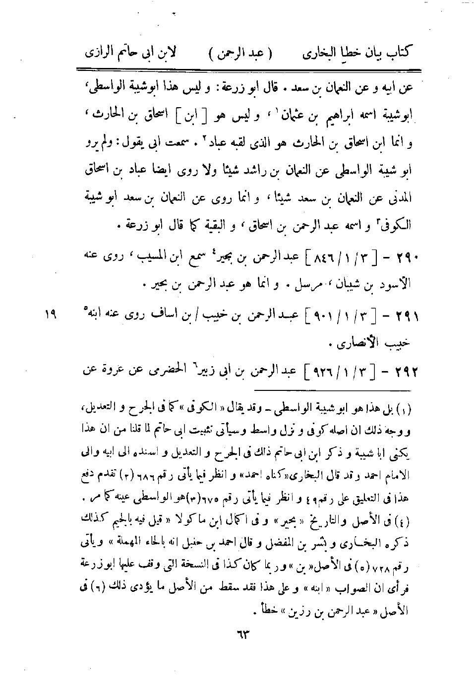 (4) في الصل والتاريخ " بحير " وفي اكمال ابن ما كولا " قيل فيه بالجيم كذلك ذكره البخاري وبشر بن المفضل وقال احمد بن حنبل انه بالحاء المهملة " ويأتى رقم 728 (5) في الاصل " بن " وربما كان كذا في النسخة التى وقف عليها أبو زرعة فرأى ان الصواب " ابنه " وعلى هذا فقد سقط من الاصل ما يؤدى ذلك (6) في الاصل " عبد الرحمن بن رزين " خطأ.