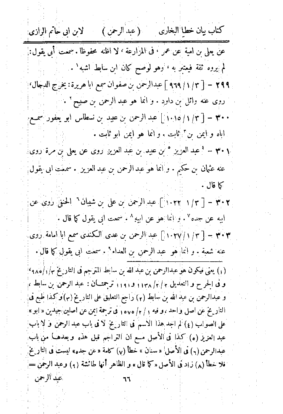 (1) يعنى فيكون هو عبد الرحمن بن عبد الله بن سابط المترجم في التاريخ 3 / 1 / 985، وفي الجرح والتعديل 2 / 2 / 138 و 1191 ترجمتان: عبد الرحمن بن سابط، وعبد الرحمن بن عبد الله بن سابط (2) راجع التعليق على التاريخ (3) وكذا طبع في التاريخ عن اصل واحد، وفيه 1 / 2 / 1575 في ترجمة ايمن عن اصلين جيدين " أبو " على الصواب (4) لم اجد هذا الاسم في التاريخ لا في باب عبد الرحمن ولا باب عبد العزيز (5) كذا في الاصل مع ان التراجم قبل هذه وبعدها من باب عبد الرحمن (6) في الاصل " سنان " خطأ (7) كلمة " عن جده " ليست في التاريخ فلا خطأ (8) زاد في الاصل " كما قال " والظاهر أنها طائشة (9) وعبد الرحمن = (*)