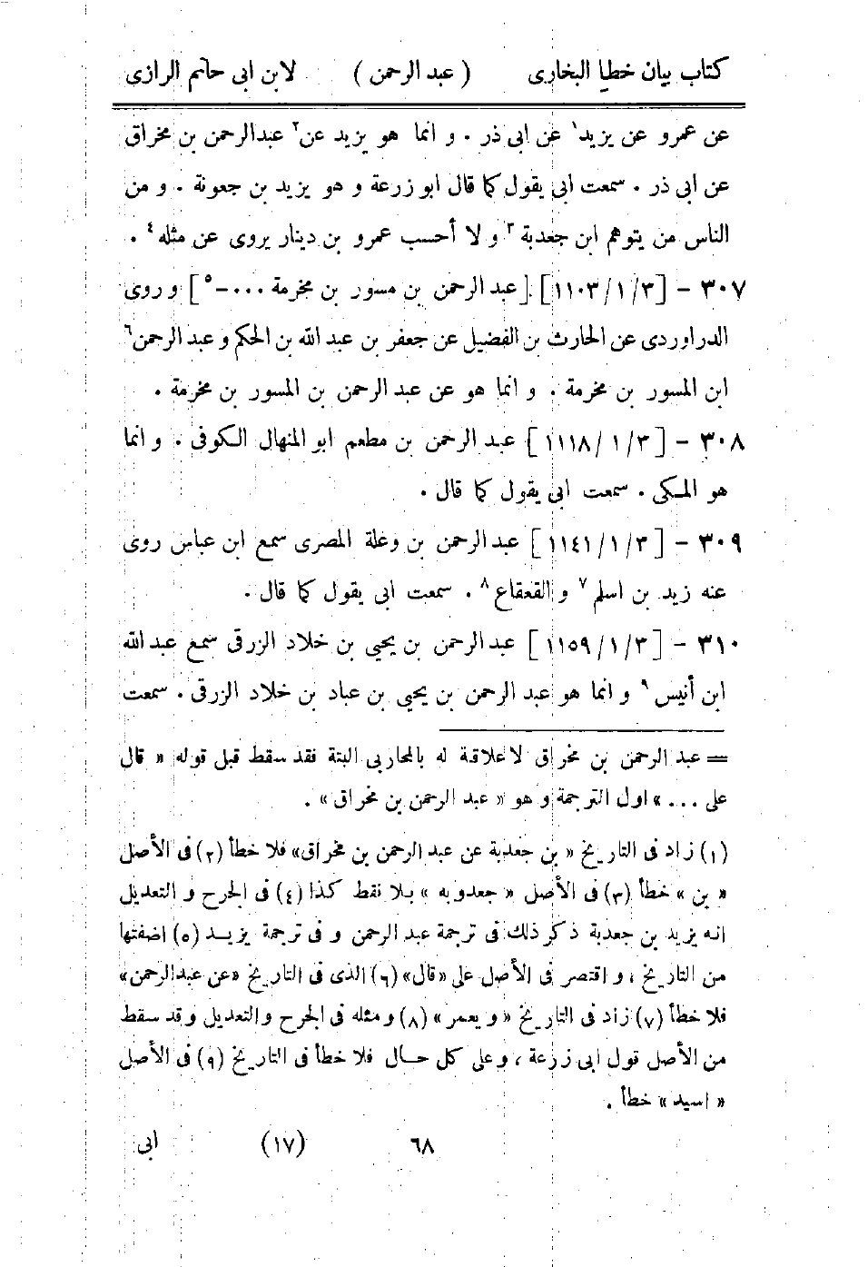 (1) زاد في التاريخ " بن جعدبة عن عبد الرحمن بن مخراق " فلا خطأ (2) في الاصل " بن " خطأ (3) في الاصل " جعدوبه " بلا نقط كذا (4) في الجرح والتعديل انه يزيد بن جعدبة ذكر ذلك في ترجمة عبد الرجمن وفي ترجمة يزيد (5) اضفتها من التاريخ، واقتصر في الاصل على " قال " (6) الذى في التاريخ " عن عبد الرحمن " فلا خطأ (7) زاد في التاريخ " ويعمر " (8) ومثله في الجرح والتعديل وقد سقط من الاصل قول ابى زرعة، وعلى كل حال فلا خطأ في التاريخ (9) في الاصل " اسيد " خطأ.