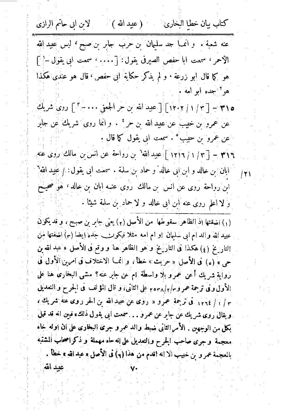 (1) اضفتها إذ الظاهر سقوطها من الاصل (2) يعنى جابر بن صبح، وقد يكون عبيد الله والدام ابى سليمان أو ام امه مثلا فيكون جده ايضا (3) اضفتها من التاريخ (4) هكذا في التاريخ وهو الظاهر هنا ووقع في الاصل " عبد الله بن حى " (5) في الاصل " حريث " خطأ، وانما الاختلاف في امرين الاول في رواية شريك أعن عمرو بلا واسطة ام عن جابر عنه؟ مشى البخاري هنا على الاول وفى ترجمة عمرو 3 / 2 / 2538 على الثاني، وقال المؤلف في الجرح والتعديل 3 / 1 / 1264 في ترجمة عمرو " روى عن عبيد الله بن الحر روى عنه شريك، ويقال روى شريك عن جابر عن عمرو ... سمعت ابى يقول ذلك " فبين انه قد قيل بكل من الوجهين.