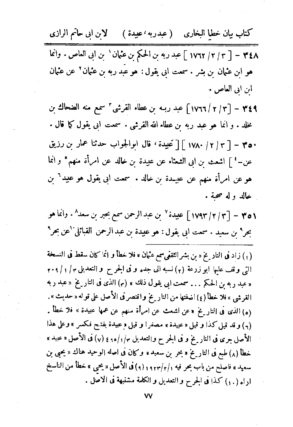 (6) وقد قيل كذا وقيل " عبيدة " مصغرا وقيل " عبيدة بفتح فكسر " وعلى هذا الاصل جرى في التاريخ وفى الجرح والتعديل 3 / 1 / 465 (7) في الاصل " عبيد " خطأ (8) طبع في التاريخ " بحر بن سعيد " وكان في اصله الوحيد هناك " يحيى بن سعيد " فاصلح من باب بحر فيه 1 / 2 / 1923 (9) في الاصل " يحيى " خطأ من الناسخ اراه (10) كذا في الجرح والتعديل والكلمة مشتبهة في الاصل.