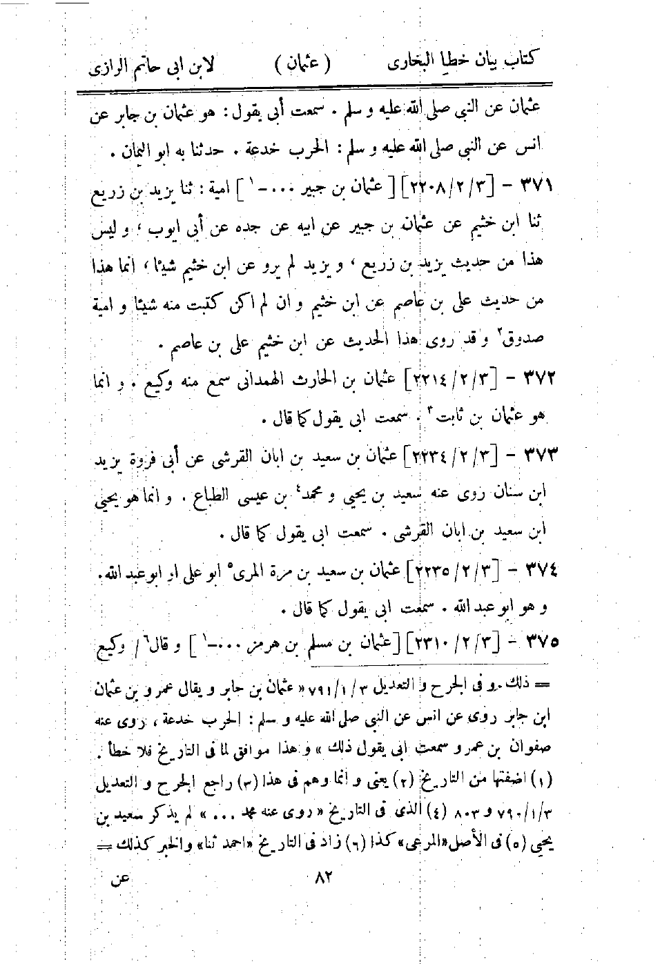 371 -[3 / 2 / 2208] [عثمان بن جبير..- (1) ] امية: ثنا يزيد بن زريع ثنا ابن خثيم عن عثمان بن جبير عن ابيه عن جده عن أبى ايوب، وليس هذا من حديث يزيد بن زريع، ويزيد لم يرو عن ابن خثيم شيئا، انما هذا من حديث على بن عاصم عن ابن خثيم وان لم اكن كتبت منه شيئا وامية صدوق (2) وقد روى هذا الحديث عن ابن خثيم على بن عاصم.
