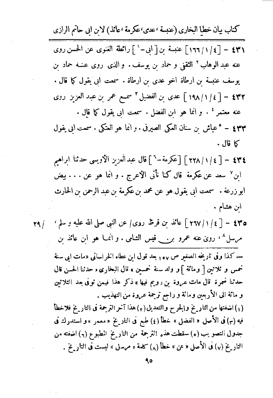 (1) اضفتها من التاريخ والجرح والتعديل (2) هذا آخر الترجمة في التاريخ فلا خطأ فيه (3) في الاصل " الفضل " خطأ (4) طبع في التاريخ " معمر " واستدرك في جدول التصويب (5) سقطت هذه الترجمة من التاريخ المطبوع (6) اضفته من التاريخ (7) في الاصل " عن " خطأ (8) كلمة " مرسل " ليست في التاريخ.