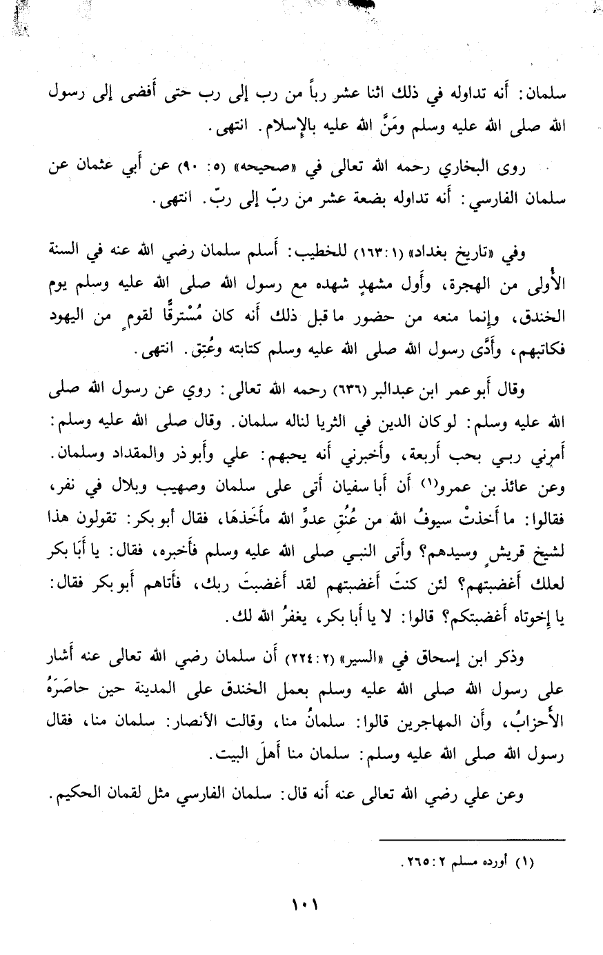 روى البخاري رحمه الله تعالى في «صحيحه» (5: 90) عن أبي عثمان عن سلمان الفارسي: أنه تداوله بضعة عشر من ربّ إلى ربّ. انتهى.