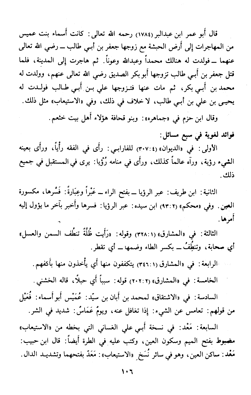 الخامسة: في «المشارق» (2: 202) قوله: سببا أي حبلا، قاله الخشني السادسة: في «الاشتقاق» لمحمد بن أبان بن سيّد: عميس أبو أسماء: فعيل من قولهم: تعامس عن الشيء: إذا تغافل عنه، ويوم عماس: شديد في الشر.