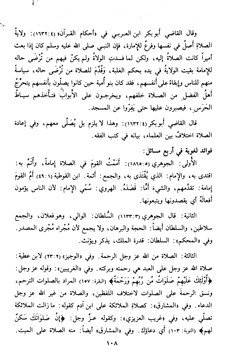وقال القاضي أبو بكر ابن العربي في «أحكام القرآن» (4: 1632) : ولاية الصلاة أصل في نفسها وفرع للإمارة، فإن النبي صلّى الله عليه وسلم كان إذا بعث أميرا كانت الصلاة إليه، ولكن لما فسدت الولاة ولم يكن فيهم من ترضى حاله للإمامة بقيت الولاية في يده بحكم الغلبة، وقدّم للصلاة من ترضى حاله، سياسة منهم للناس وإبقاء على أنفسهم، فقد كان بنو أمية حين كانوا يصلّون بأنفسهم يتحرّج أهل الفضل من الصلاة خلفهم، ويخرجون على الأبواب فتأخذهم سياط الحرس، فيصبرون عليها حتى يفرّوا عن المسجد.