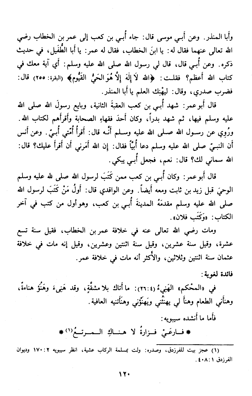 وروي عن رسول الله صلّى الله عليه وسلم أنّه قال: أقرأ أمّتي أبيّ. وعن أنس أن النبيّ صلّى الله عليه وسلم دعا أبيّا فقال: إن الله أمرني أن أقرأ عليك؟ قال: