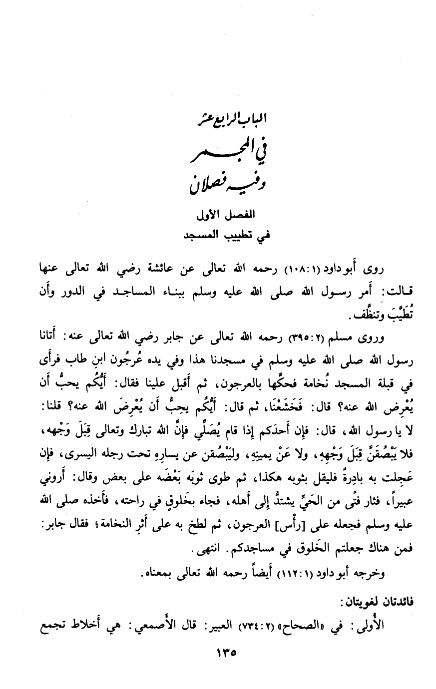 روى أبو داود (1: 108) رحمه الله تعالى عن عائشة رضي الله تعالى عنها قالت: أمر رسول الله صلّى الله عليه وسلم ببناء المساجد في الدور وأن تطيّب وتنظّف.