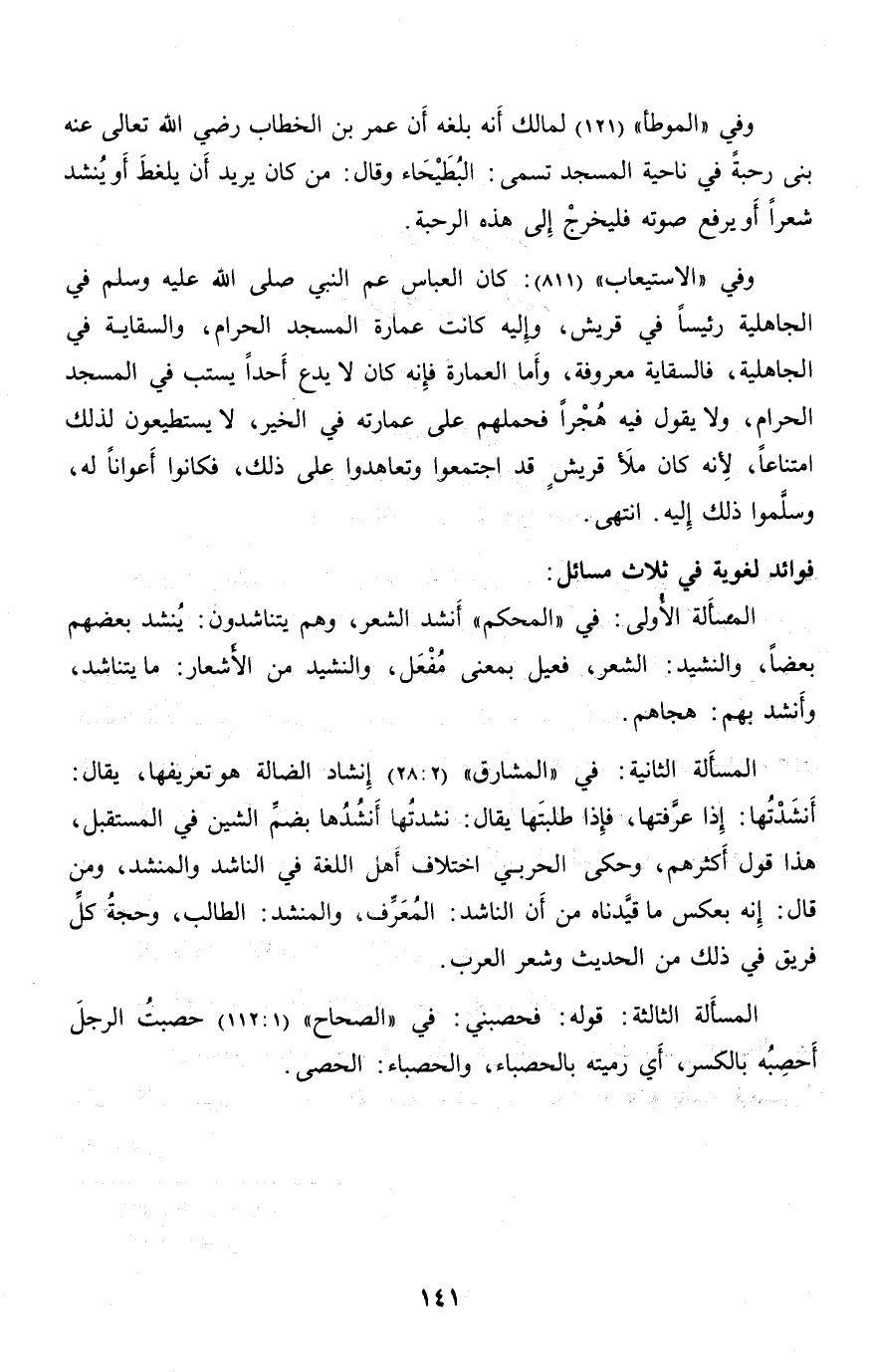 المسألة الأولى: في «المحكم» أنشد الشعر، وهم يتناشدون: ينشد بعضهم بعضا، والنشيد: الشعر، فعيل بمعنى مفعل، والنشيد من الأشعار: ما يتناشد، وأنشد بهم: هجاهم.