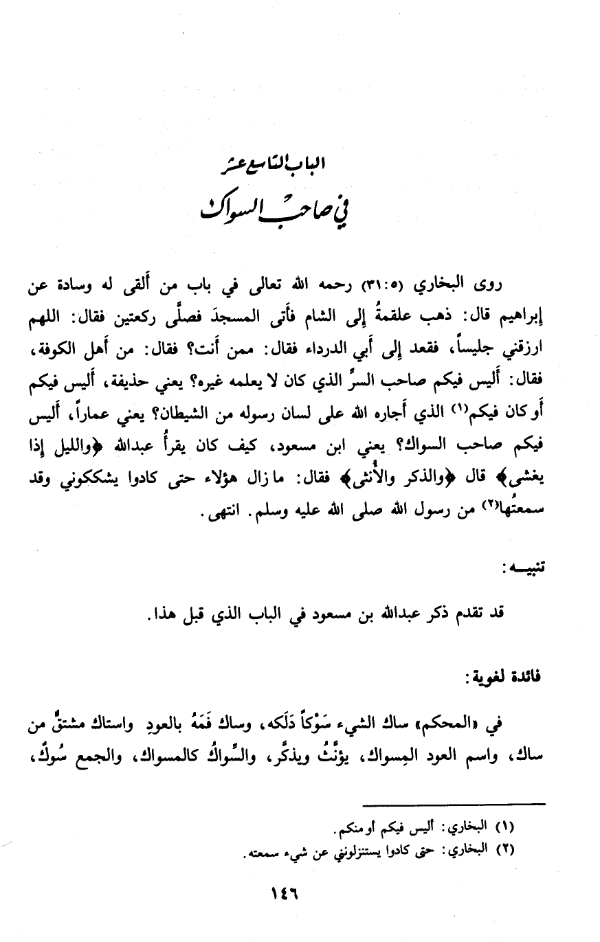 روى البخاري (5: 31) رحمه الله تعالى في باب من ألقى له وسادة عن إبراهيم قال: ذهب علقمة إلى الشام فأتى المسجد فصلّى ركعتين فقال: اللهم ارزقني جليسا، فقعد إلى أبي الدرداء فقال: ممن أنت؟ فقال: من أهل الكوفة، فقال: أليس فيكم صاحب السرّ الذي كان لا يعلمه غيره؟ يعني حذيفة، أليس فيكم أو كان فيكم «1» الذي أجاره الله على لسان رسوله من الشيطان؟ يعني عمارا، أليس فيكم صاحب السواك؟ يعني ابن مسعود، كيف كان يقرأ عبد الله وَاللَّيْلِ إِذا يَغْشى قال والذكر والأنثى فقال: ما زال هؤلاء حتى كادوا يشككوني وقد سمعتها «2» من رسول الله صلّى الله عليه وسلم. انتهى.
