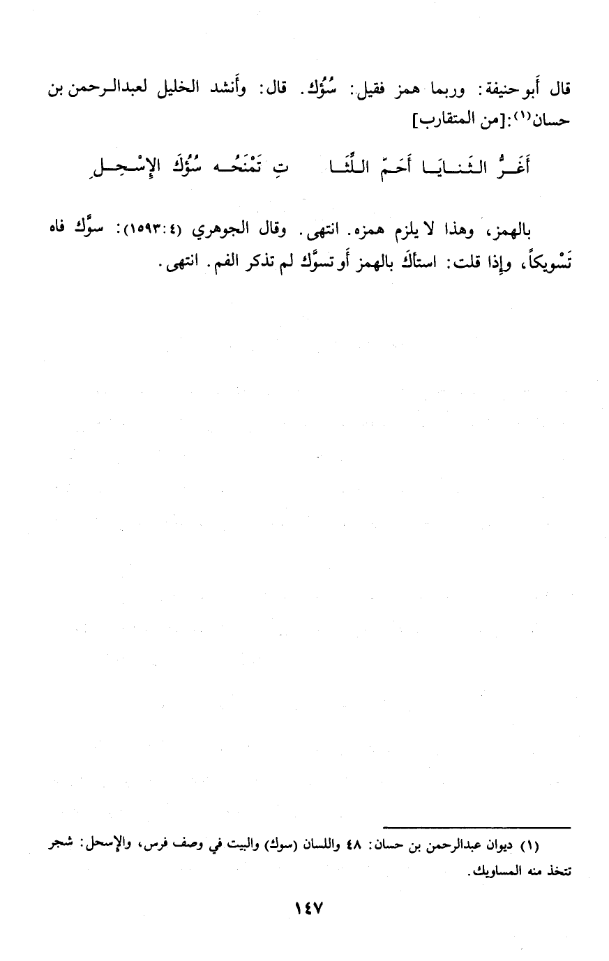 (1) ديوان عبد الرّحمن بن حسان: 48 واللسان (سوك) والبيت في وصف فرس، والإسحل: شجر تتخذ منه المساويك.