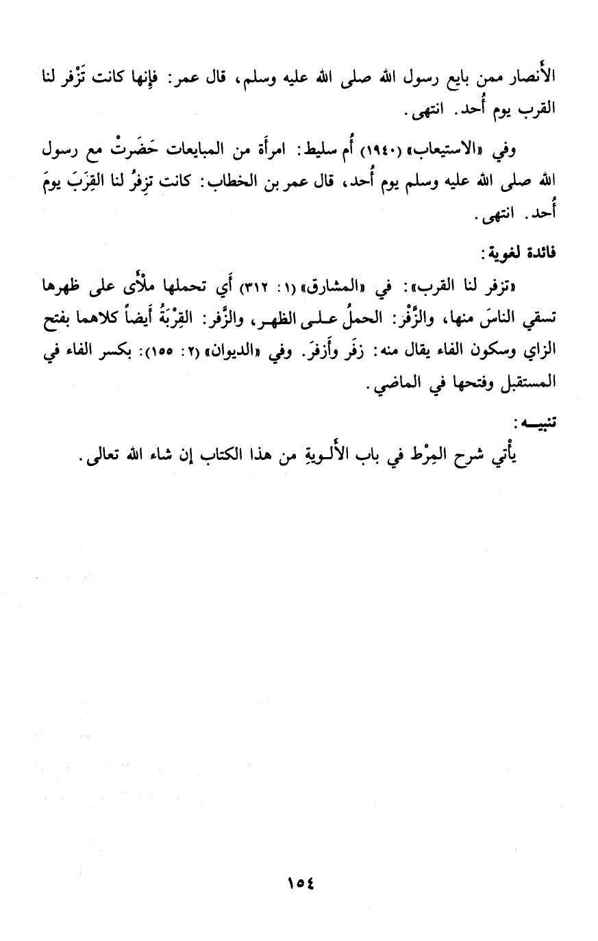 «تزفر لنا القرب» : في «المشارق» (1: 312) أي تحملها ملأى على ظهرها تسقي الناس منها، والزّفر: الحمل على الظهر، والزّفر: القربة أيضا كلاهما بفتح الزاي وسكون الفاء يقال منه: زفر وأزفر. وفي «الديوان» (2: 155) : بكسر الفاء في المستقبل وفتحها في الماضي.