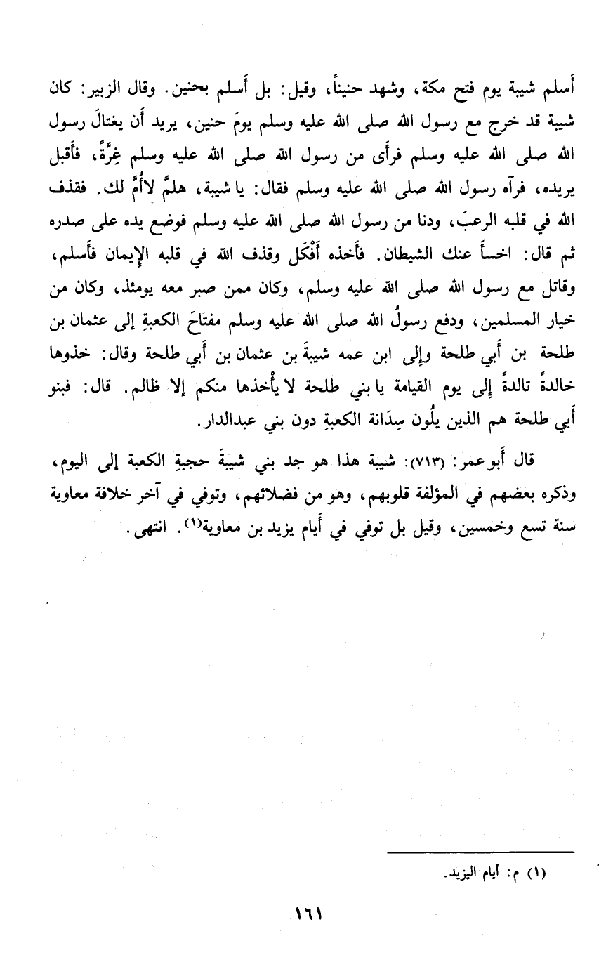 قال أبو عمر: (713) : شيبة هذا هو جد بني شيبة حجبة الكعبة إلى اليوم، وذكره بعضهم في المؤلفة قلوبهم، وهو من فضلائهم، وتوفي في آخر خلافة معاوية سنة تسع وخمسين، وقيل بل توفي في أيام يزيد بن معاوية «1» . انتهى.