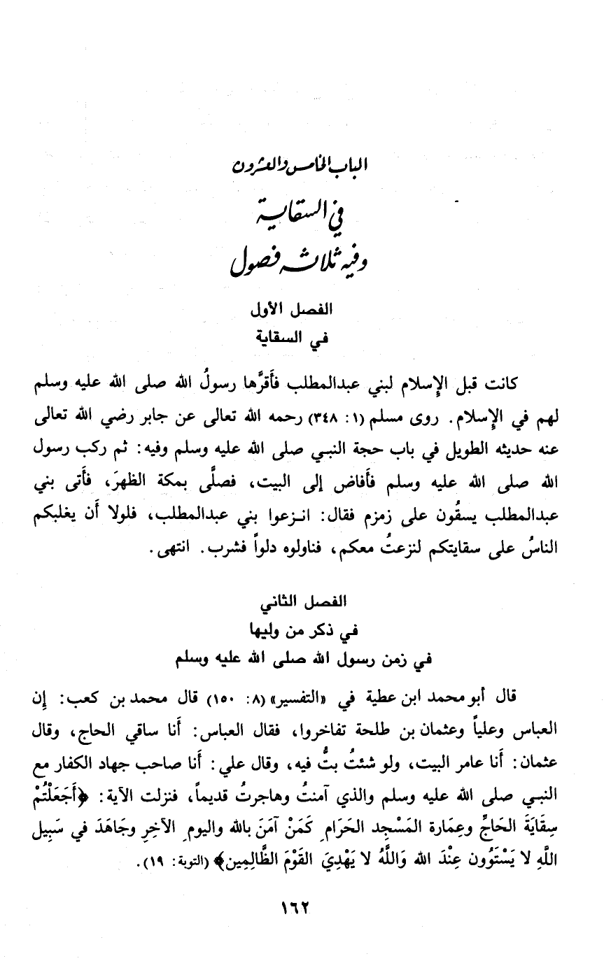 قال أبو محمد ابن عطية في «التفسير» (8: 150) قال محمد بن كعب: إن العباس وعليا وعثمان بن طلحة تفاخروا، فقال العباس: أنا ساقي الحاج، وقال عثمان: أنا عامر البيت، ولو شئت بتّ فيه، وقال علي: أنا صاحب جهاد الكفار مع النبي صلّى الله عليه وسلم والذي آمنت وهاجرت قديما، فنزلت الآية: أَجَعَلْتُمْ سِقايَةَ الْحاجِّ وَعِمارَةَ الْمَسْجِدِ الْحَرامِ كَمَنْ آمَنَ بِاللَّهِ وَالْيَوْمِ الْآخِرِ وَجاهَدَ فِي سَبِيلِ اللَّهِ لا يَسْتَوُونَ عِنْدَ اللَّهِ وَاللَّهُ لا يَهْدِي الْقَوْمَ الظَّالِمِينَ (التوبة: 19) .