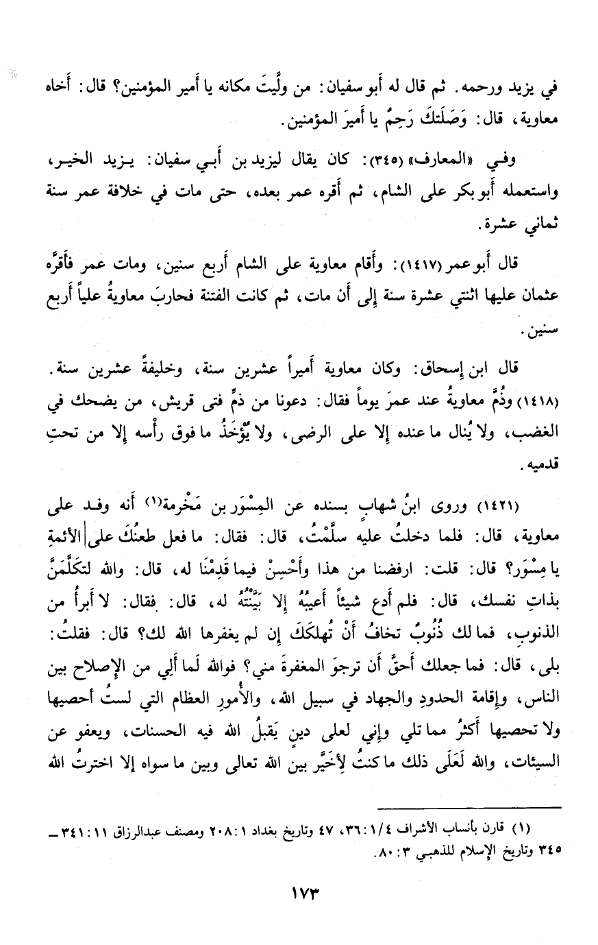 (1) قارن بأنساب الأشراف 4/ 1: 36، 47 وتاريخ بغداد 1: 208 ومصنف عبد الرزاق 11: 341- 345 وتاريخ الإسلام للذهبي 3: 80.