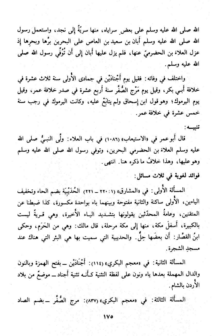 المسألة الثانية: في «معجم البكري» (114) : أجنادين- بفتح الهمزة وبالنون والدال المهملة بعدها ياء ونون على لفظة التثنية كأنه تثنية أجناد- موضع من بلاد الأردن بالشام.