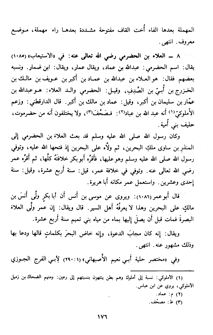 رضي الله تعالى عنه: في «الاستيعاب» (1085) يقال: اسم الحضرمي: عبد الله بن عماد، ويقال عمار، ويقال: ابن ضمار. ونسبه بعضهم فقال: هو العلاء بن عبد الله بن عماد بن أكبر بن عويف بن مالك بن الخزرج بن أبيّ بن الصّدف، وقيل: الحضرمي والد العلاء: هو عبد الله بن عمّار بن سليمان بن أكبر، وقيل: عماد بن مالك بن أكبر. قال الدارقطني: وزعم الأملوكيّ «1» أنه عبد الله بن عباد «2» : فصحّف»
