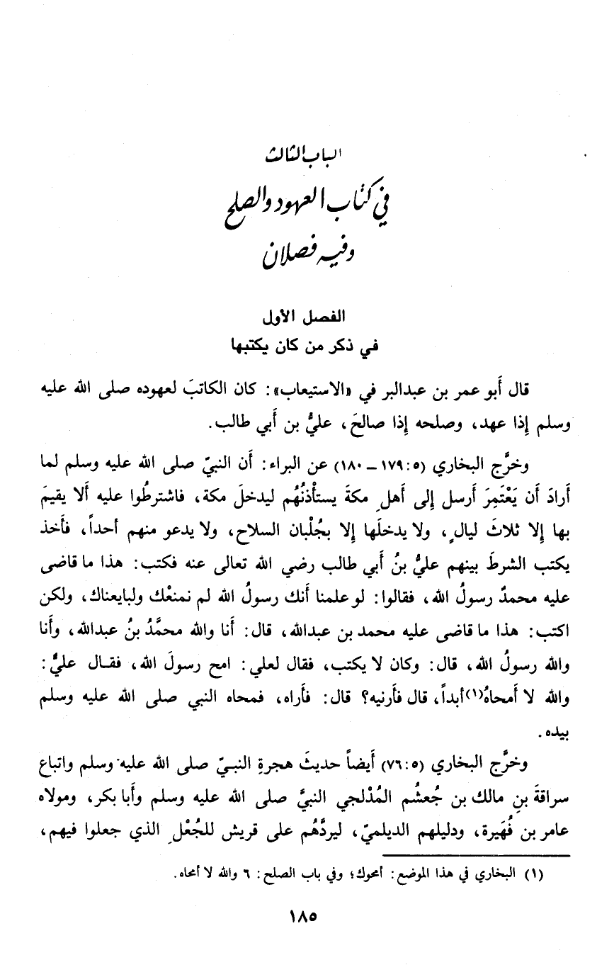 وخرّج البخاري (5: 179- 180) عن البراء: أن النبيّ صلّى الله عليه وسلم لما أراد أن يعتمر أرسل إلى أهل مكة يستأذنهم ليدخل مكة، فاشترطوا عليه ألا يقيم بها إلا ثلاث ليال، ولا يدخلها إلا بجلبان السلاح، ولا يدعو منهم أحدا، فأخذ يكتب الشرط بينهم عليّ بن أبي طالب رضي الله تعالى عنه فكتب: هذا ما قاضى عليه محمد رسول الله، فقالوا: لو علمنا أنك رسول الله لم نمنعك ولبايعناك، ولكن اكتب: هذا ما قاضى عليه محمد بن عبد الله، قال: أنا والله محمّد بن عبد الله، وأنا والله رسول الله، قال: وكان لا يكتب، فقال لعلي: امح رسول الله، فقال عليّ: