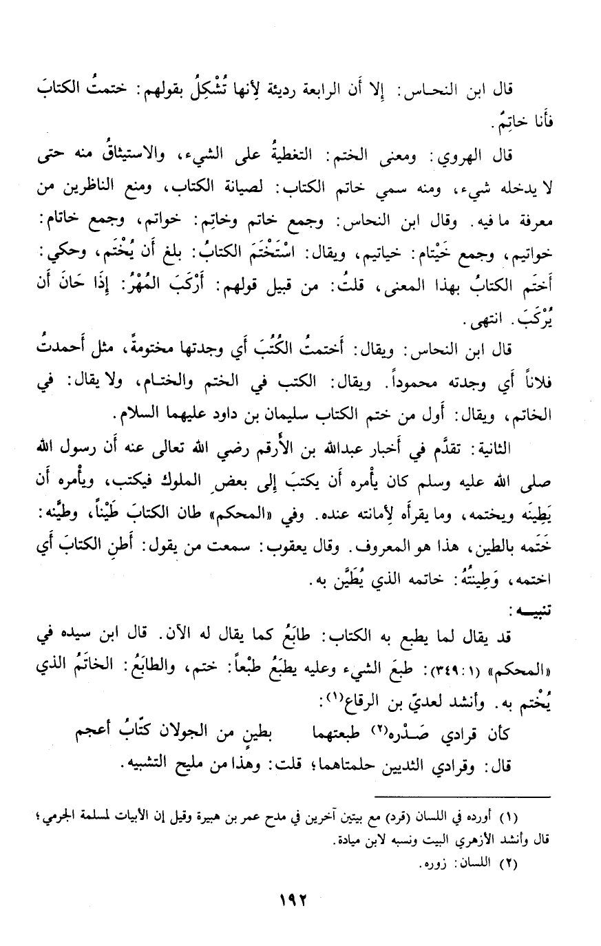 قد يقال لما يطبع به الكتاب: طابع كما يقال له الآن. قال ابن سيده في «المحكم» (1: 349) : طبع الشيء وعليه يطبع طبعا: ختم، والطابع: الخاتم الذي يختم به. وأنشد لعديّ بن الرقاع «1» :