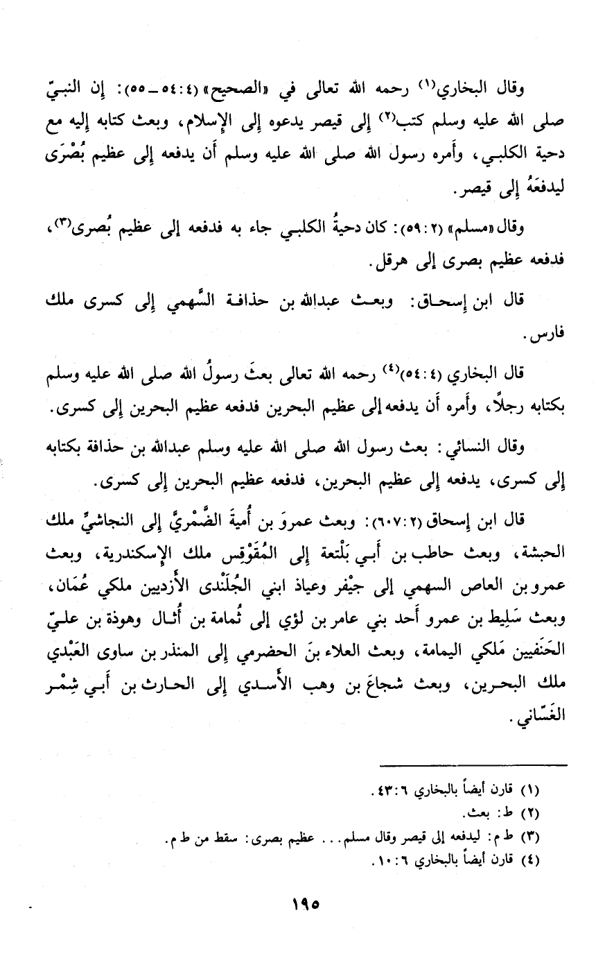 قال البخاري (4: 54) «4» رحمه الله تعالى بعث رسول الله صلّى الله عليه وسلم بكتابه رجلا، وأمره أن يدفعه إلى عظيم البحرين فدفعه عظيم البحرين إلى كسرى.