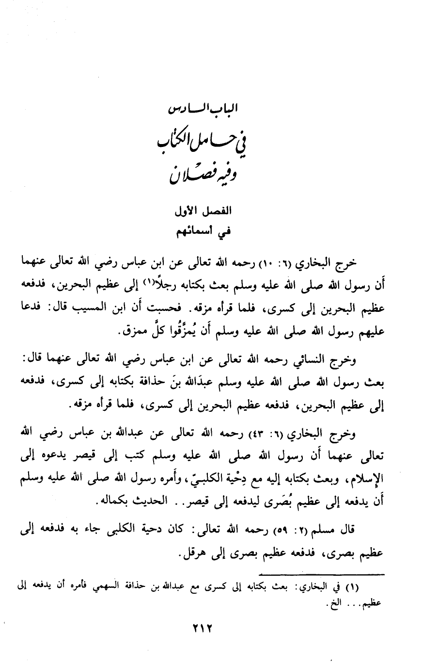 (1) في البخاري: بعث بكتابه إلى كسرى مع عبد الله بن حذافة السهمي فأمره أن يدفعه إلى عظيم ... الخ.