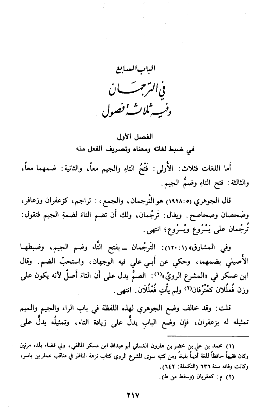 وفي المشارق» (1: 120) : الترجمان- بفتح التّاء وضم الجيم، وضبطها الأصيلي بضمهما، وحكي عن أبي علي فيه الوجهان، واستحبّ الضم. وقال ابن عسكر في «المشرع الرويّ» «1» : الضمّ يدل على أن التاء أصل لأنه يكون على وزن فعللان كعترفان «2» ولم يأت فعللان. انتهى.