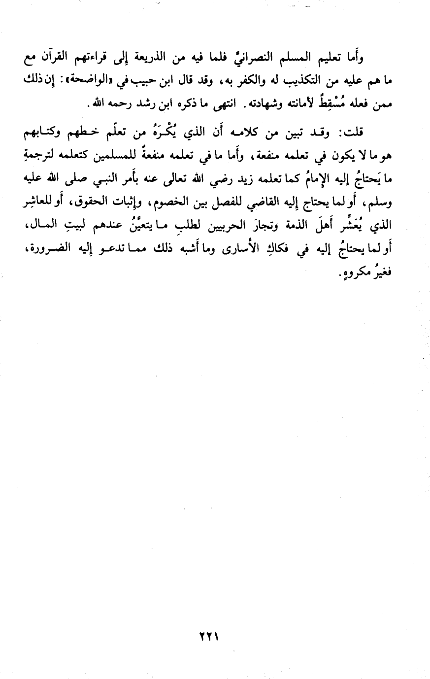 قلت: وقد تبين من كلامه أن الذي يكره من تعلّم خطهم وكتابهم هو ما لا يكون في تعلمه منفعة، وأما ما في تعلمه منفعة للمسلمين كتعلمه لترجمة ما يحتاج إليه الإمام كما تعلمه زيد رضي الله تعالى عنه بأمر النبي صلّى الله عليه وسلم، أو لما يحتاج إليه القاضي للفصل بين الخصوم، وإثبات الحقوق، أو للعاشر الذي يعشّر أهل الذمة وتجار الحربيين لطلب ما يتعيّن عندهم لبيت المال، أو لما يحتاج إليه في فكاك الأسارى وما أشبه ذلك مما تدعو إليه الضرورة، فغير مكروه.