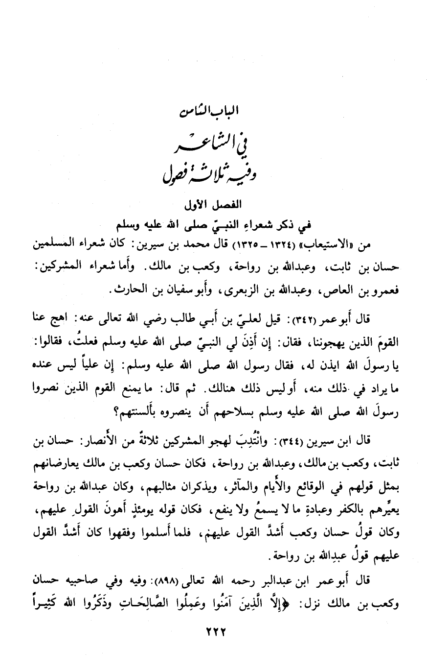 من «الاستيعاب» (1324- 1325) قال محمد بن سيرين: كان شعراء المسلمين حسان بن ثابت، وعبد الله بن رواحة، وكعب بن مالك. وأما شعراء المشركين: