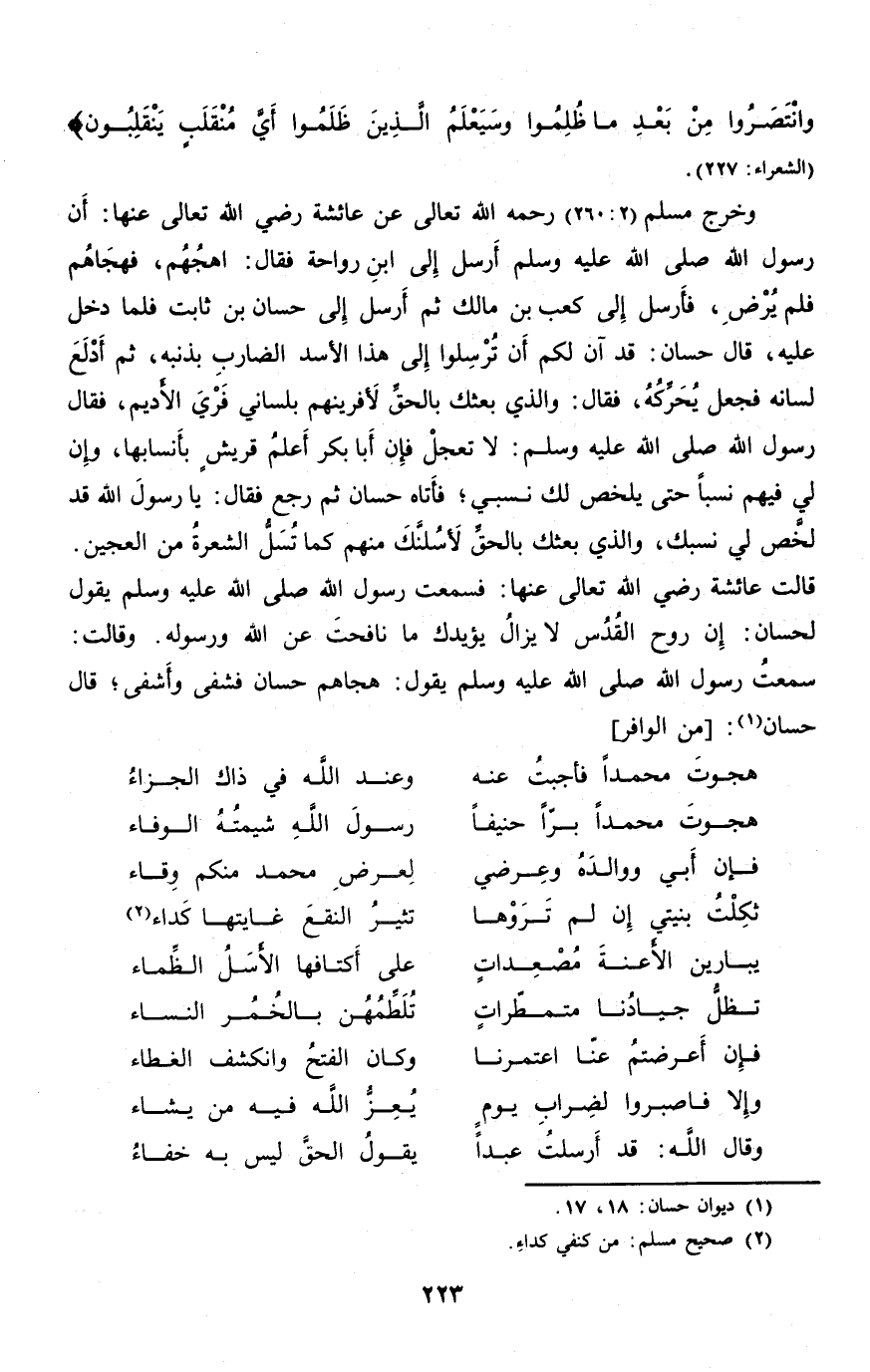 وخرج مسلم (2: 260) رحمه الله تعالى عن عائشة رضي الله تعالى عنها: أن رسول الله صلّى الله عليه وسلم أرسل إلى ابن رواحة فقال: اهجهم، فهجاهم فلم يرض، فأرسل إلى كعب بن مالك ثم أرسل إلى حسان بن ثابت فلما دخل عليه، قال حسان: قد آن لكم أن ترسلوا إلى هذا الأسد الضارب بذنبه، ثم أدلع لسانه فجعل يحرّكه، فقال: والذي بعثك بالحقّ لأفرينهم بلساني فري الأديم، فقال رسول الله صلّى الله عليه وسلم: لا تعجل فإن أبا بكر أعلم قريش بأنسابها، وإن لي فيهم نسبا حتى يلخص لك نسبي؛ فأتاه حسان ثم رجع فقال: يا رسول الله قد لخّص لي نسبك، والذي بعثك بالحقّ لأسلنّك منهم كما تسلّ الشعرة من العجين.
