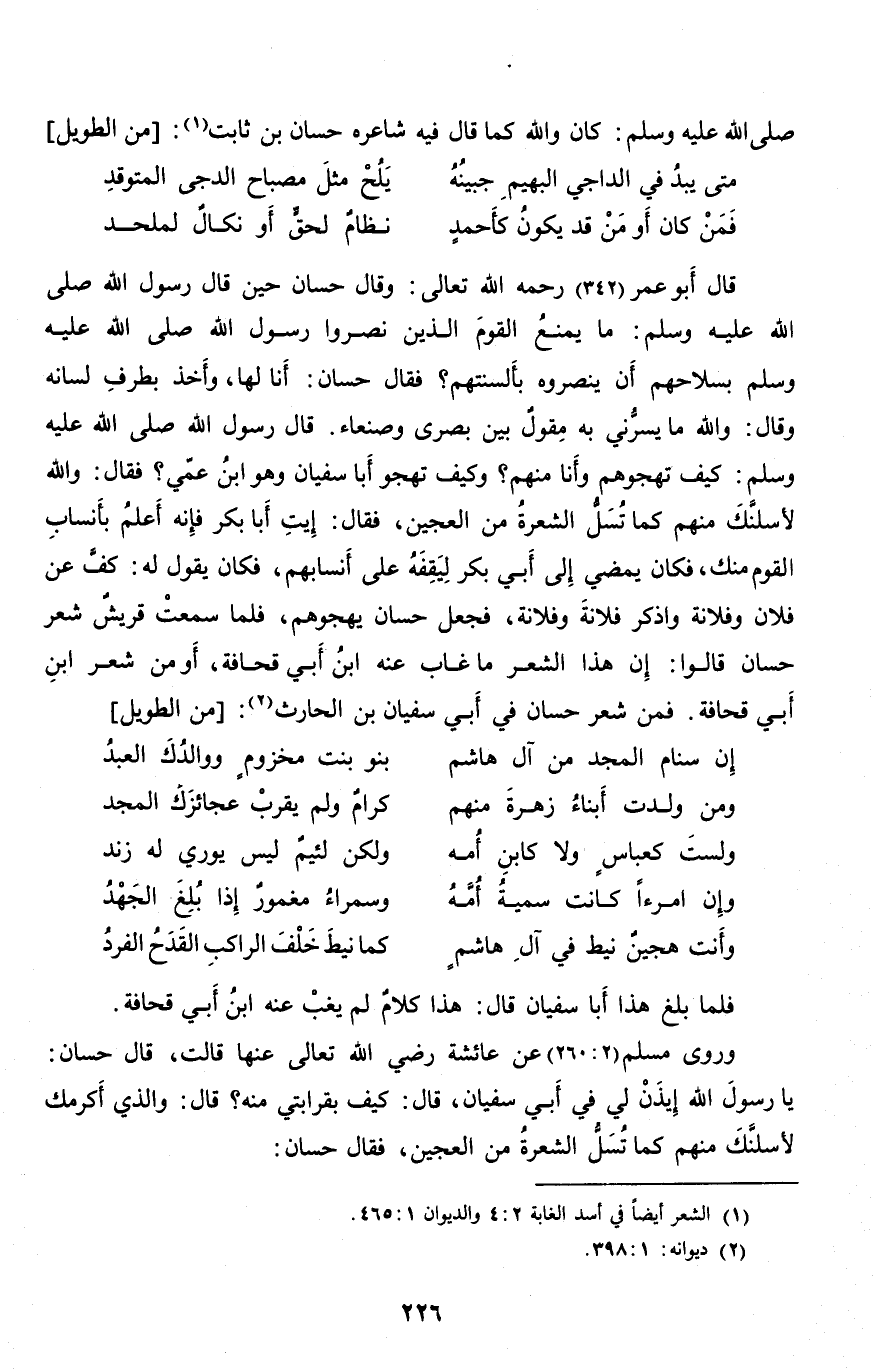 قال أبو عمر (342) رحمه الله تعالى: وقال حسان حين قال رسول الله صلّى الله عليه وسلم: ما يمنع القوم الذين نصروا رسول الله صلّى الله عليه وسلم بسلاحهم أن ينصروه بألسنتهم؟ فقال حسان: أنا لها، وأخذ بطرف لسانه وقال: والله ما يسرّني به مقول بين بصرى وصنعاء. قال رسول الله صلّى الله عليه وسلم: كيف تهجوهم وأنا منهم؟ وكيف تهجو أبا سفيان وهو ابن عمّي؟ فقال: والله لأسلنّك منهم كما تسلّ الشعرة من العجين، فقال: إيت أبا بكر فإنه أعلم بأنساب القوم منك، فكان يمضي إلى أبي بكر ليقفه على أنسابهم، فكان يقول له: كفّ عن فلان وفلانة واذكر فلانة وفلانة، فجعل حسان يهجوهم، فلما سمعت قريش شعر حسان قالوا: إن هذا الشعر ما غاب عنه ابن أبي قحافة، أو من شعر ابن أبي قحافة. فمن شعر حسان في أبي سفيان بن الحارث «2» : [من الطويل]