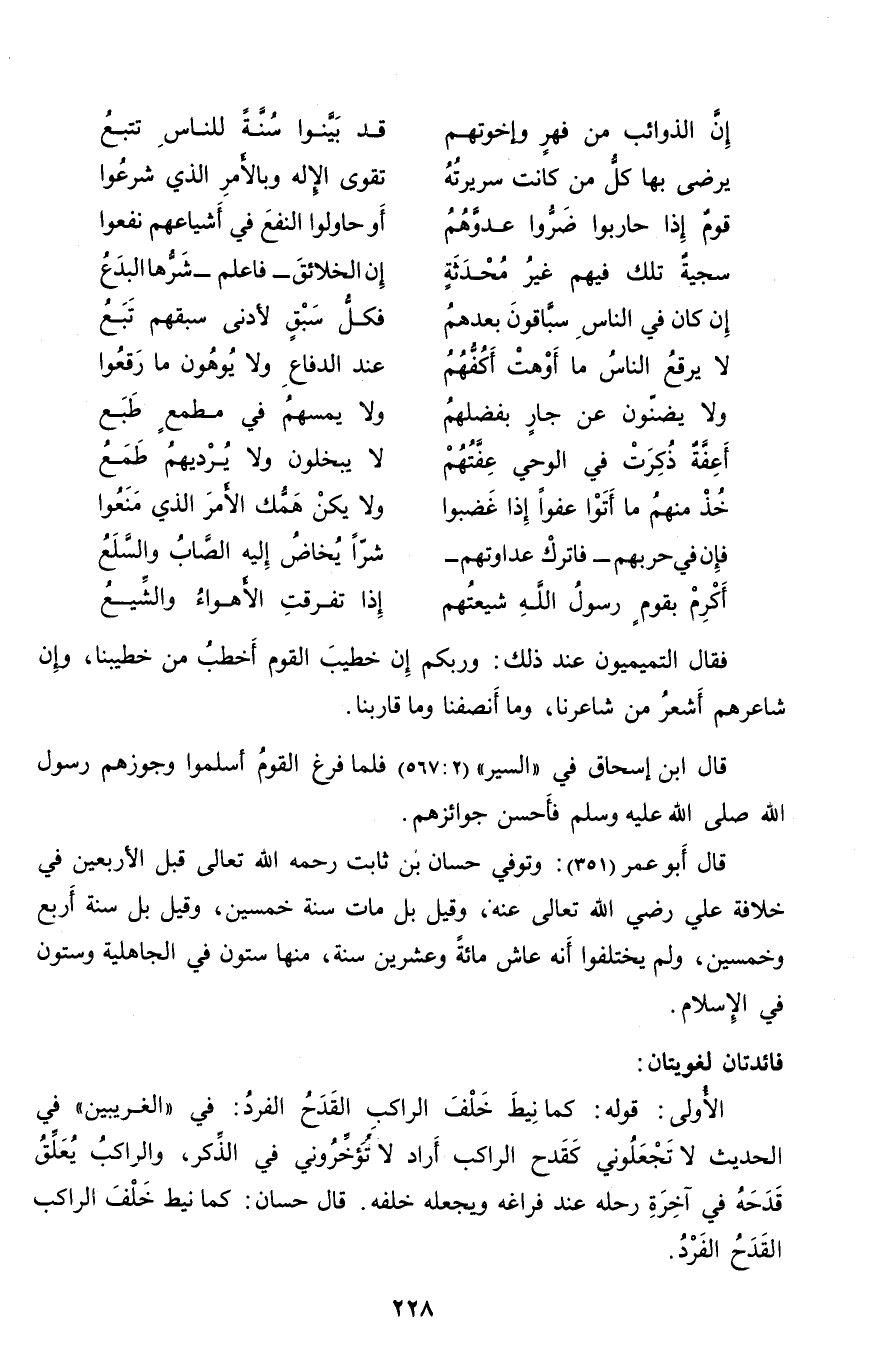 الأولى: قوله: كما نيط خلف الراكب القدح الفرد: في «الغريبين» في الحديث لا تجعلوني كقدح الراكب أراد لا تؤخّروني في الذّكر، والراكب يعلّق قدحه في آخرة رحله عند فراغه ويجعله خلفه. قال حسان: كما نيط خلف الراكب القدح الفرد.
