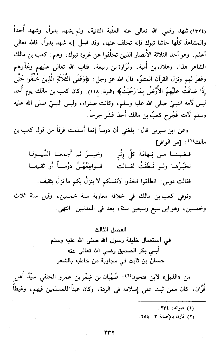 (1324) شهد رضي الله تعالى عنه العقبة الثانية، ولم يشهد بدرا، وشهد أحدا والمشاهد كلّها حاشا تبوك فإنه تخلف عنها، وقد قيل إنه شهد بدرا، فالله تعالى أعلم. وهو أحد الثلاثة الأنصار الذين تخلّفوا عن غزوة تبوك، وهم: كعب بن مالك الشاعر هذا، وهلال بن أمية، ومرارة بن ربيعة، فتاب الله تعالى عليهم وعذرهم وغفر لهم ونزل القرآن المتلوّ، قال الله عز وجل: وَعَلَى الثَّلاثَةِ الَّذِينَ خُلِّفُوا حَتَّى إِذا ضاقَتْ عَلَيْهِمُ الْأَرْضُ بِما رَحُبَتْ (التوبة: 118) . وكان كعب بن مالك يوم أحد لبس لأمة النبيّ صلّى الله عليه وسلم، وكانت صفراء، ولبس النبيّ صلّى الله عليه وسلم لأمته فجرح كعب بن مالك أحد عشر جرحا.