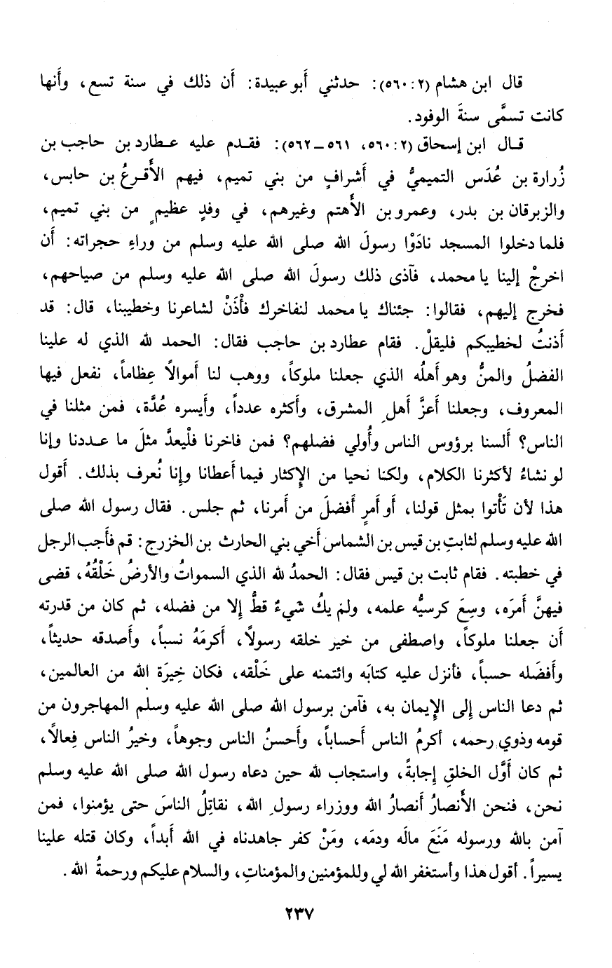 قال ابن إسحاق (2: 560، 561- 562) : فقدم عليه عطارد بن حاجب بن زرارة بن عدس التميميّ في أشراف من بني تميم، فيهم الأقرع بن حابس، والزبرقان بن بدر، وعمرو بن الأهتم وغيرهم، في وفد عظيم من بني تميم، فلما دخلوا المسجد نادوا رسول الله صلّى الله عليه وسلم من وراء حجراته: أن اخرج إلينا يا محمد، فآذى ذلك رسول الله صلّى الله عليه وسلم من صياحهم، فخرج إليهم، فقالوا: جئناك يا محمد لنفاخرك فأذن لشاعرنا وخطيبنا، قال: قد أذنت لخطيبكم فليقل. فقام عطارد بن حاجب فقال: الحمد لله الذي له علينا الفضل والمنّ وهو أهله الذي جعلنا ملوكا، ووهب لنا أموالا عظاما، نفعل فيها المعروف، وجعلنا أعزّ أهل المشرق، وأكثره عددا، وأيسره عدّة، فمن مثلنا في الناس؟ ألسنا برؤوس الناس وأولي فضلهم؟ فمن فاخرنا فليعدّ مثل ما عددنا وإنا لو نشاء لأكثرنا الكلام، ولكنا نحيا من الإكثار فيما أعطانا وإنا نعرف بذلك. أقول هذا لأن تأتوا بمثل قولنا، أو أمر أفضل من أمرنا، ثم جلس. فقال رسول الله صلّى الله عليه وسلم لثابت بن قيس بن الشماس أخي بني الحارث بن الخزرج: قم فأجب الرجل في خطبته. فقام ثابت بن قيس فقال: الحمد لله الذي السموات والأرض خلقه، قضى فيهنّ أمره، وسع كرسيّه علمه، ولم يك شيء قطّ إلا من فضله، ثم كان من قدرته أن جعلنا ملوكا، واصطفى من خير خلقه رسولا، أكرمه نسبا، وأصدقه حديثا، وأفضله حسبا، فأنزل عليه كتابه وائتمنه على خلقه، فكان خيرة الله من العالمين، ثم دعا الناس إلى الإيمان به، فآمن برسول الله صلّى الله عليه وسلم المهاجرون من قومه وذوي رحمه، أكرم الناس أحسابا، وأحسن الناس وجوها، وخير الناس فعالا، ثم كان أوّل الخلق إجابة، واستجاب لله حين دعاه رسول الله صلّى الله عليه وسلم نحن، فنحن الأنصار أنصار الله ووزراء رسول الله، نقاتل الناس حتى يؤمنوا، فمن آمن بالله ورسوله منع ماله ودمه، ومن كفر جاهدناه في الله أبدا، وكان قتله علينا يسيرا. أقول هذا وأستغفر الله لي وللمؤمنين والمؤمنات، والسلام عليكم ورحمة الله.