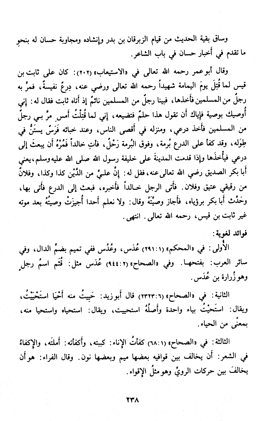 وقال أبو عمر رحمه الله تعالى في «الاستيعاب» (202) : كان على ثابت بن قيس لما قتل يوم اليمامة شهيدا رحمه الله تعالى ورضي عنه، درع نفيسة، فمرّ به رجل من المسلمين فأخذها، فبينا رجل من المسلمين نائم إذا أتاه ثابت فقال له: إني أوصيك بوصية فإياك أن تقول هذا حلم فتضيعه، إني لما قتلت أمس مرّ بي رجل من المسلمين فأخذ درعي، ومنزله في أقصى الناس، وعند خبائه فرس يستنّ في طوله، وقد كفأ على الدرع برمة، وفوق البرمة رحل، فأت خالدا فمره أن يبعث إلى درعي فيأخذها وإذا قدمت المدينة على خليفة رسول الله صلّى الله عليه وسلم، يعني أبا بكر الصديق رضي الله تعالى عنه، فقل له: إنّ عليّ من الدّين كذا وكذا، وفلان من رقيقي عتيق وفلان. فأتى الرجل خالدا فأخبره، فبعث إلى الدرع فأتى بها، وحدّث أبا بكر برؤياه، فأجاز وصيّته وقال: ولا نعلم أحدا أجيزت وصيته بعد موته غير ثابت بن قيس، رحمه الله تعالى. انتهى.