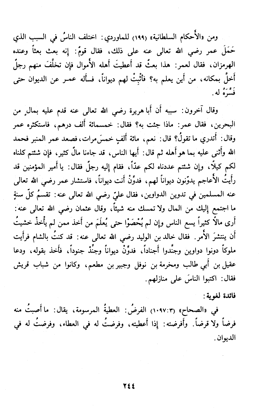 ومن «الأحكام السلطانية» (199) للماوردي: اختلف الناس في السبب الذي حمل عمر رضي الله تعالى عنه على ذلك، فقال قوم: إنه بعث بعثا وعنده الهرمزان، فقال لعمر: هذا بعث قد أعطيت أهله الأموال فإن تخلّف منهم رجل أخلّ بمكانه، من أين يعلم به؟ فأثبت لهم ديوانا، فسأله عمر عن الديوان حتى فسّره له.
