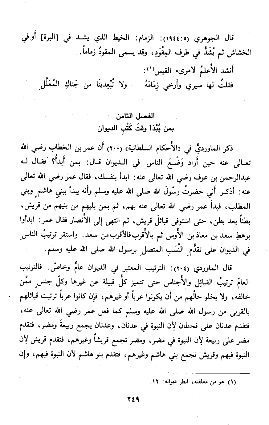 قال الماوردي (204) : الترتيب المعتبر في الديوان عامّ وخاصّ. فالترتيب العامّ ترتيب القبائل والأجناس حتى تتميز كلّ قبيلة عن غيرها وكلّ جنس ممّن خالفه، ولا يخلو حالهم من أن يكونوا عربا أو غيرهم، فإن كانوا عربا ترتبت قبائلهم بالقربى من رسول الله صلّى الله عليه وسلم كما فعل عمر رضي الله تعالى عنه، فتقدم عدنان على قحطان لأن النبوة في عدنان، وعدنان يجمع ربيعة ومضر، فتقدم مضر على ربيعة لأن النبوة في مضر، ومضر تجمع قريشا وغيرهم، فتقدم قريش لأن النبوة فيهم وقريش تجمع بني هاشم وغيرهم، فتقدم بنو هاشم لأن النبوة فيهم، وإن