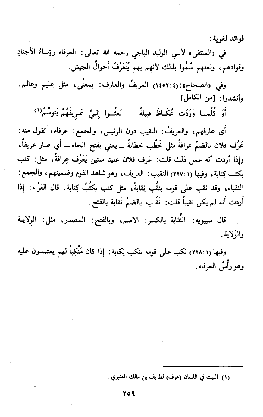 عرف فلان بالضمّ عرافة مثل خطب خطابة- يعني بفتح الخاء- أي صار عريفا، وإذا أردت أنه عمل ذلك قلت: عرف فلان علينا سنين يعرف عرافة، مثل: كتب يكتب كتابة، وفيها (1: 227) النقيب: العريف، وهو شاهد القوم وضمينهم، والجمع: