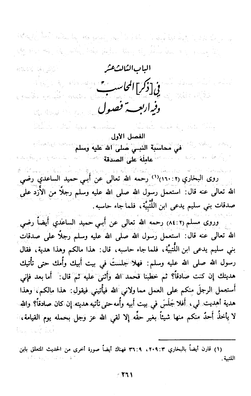 روى البخاري (2: 160) «1» رحمه الله تعالى عن أبي حميد الساعدي رضي الله تعالى عنه قال: استعمل رسول الله صلّى الله عليه وسلم رجلا من الأزد على صدقات بني سليم يدعى ابن اللّتبيّة، فلما جاء حاسبه.