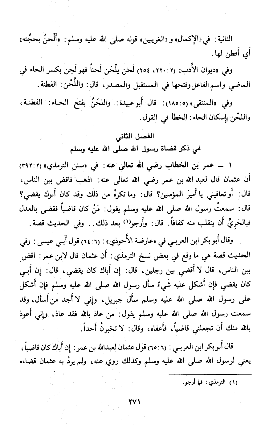 وقال أبو بكر ابن العربي في «عارضة الأحوذي» : (6: 64) قول أبي عيسى: وفي الحديث قصة هي ما وقع في بعض نسخ الترمذي: أن عثمان قال لابن عمر: اقض بين الناس، قال لا أقضي بين رجلين، قال: إن أباك كان يقضي، قال: إن أبي كان يقضي فإن أشكل عليه شيء سأل رسول الله صلّى الله عليه وسلم فإن أشكل على رسول الله صلّى الله عليه وسلم سأل جبريل، وإني لا أجد من أسأل، وقد سمعت رسول الله صلّى الله عليه وسلم يقول: من عاذ بالله فقد عاذ، وإني أعوذ بالله منك أن تجعلني قاضيا، فأعفاه، وقال: لا تخبرنّ أحدا.